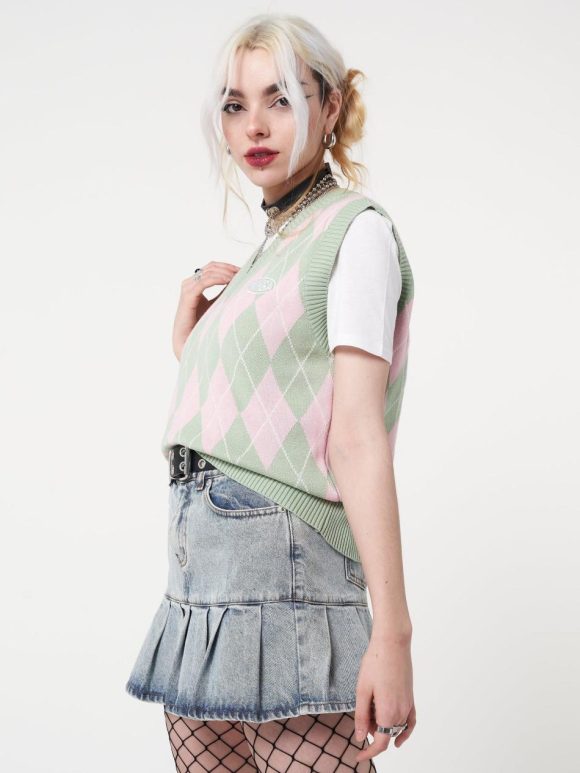 - Knitted sweater vest in pink and sage green
